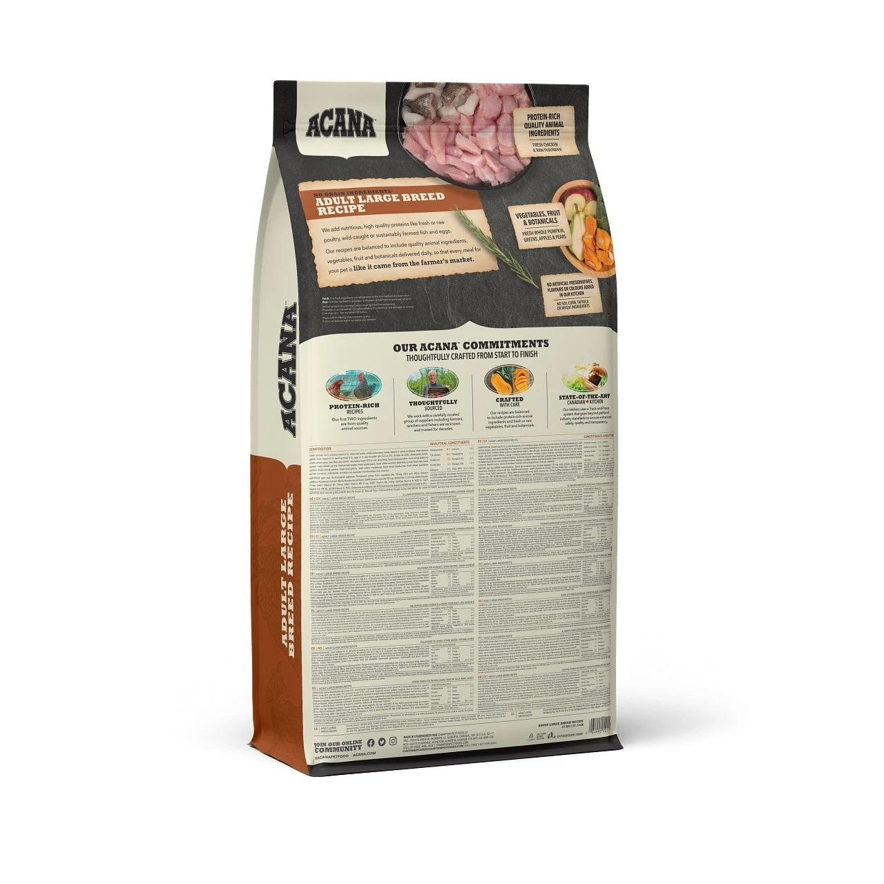 Lorsqu’il s’agit de nourriture pour chiens ACANAMD, chaque ingrĂ©dient compte, c’est pourquoi notre recette pour chiens adultes a Ă©tĂ© soigneusement formulĂ©e pour rĂ©pondre aux besoins des chiens adultes de grandes races. Riche de 60 % d’ingrĂ©dients d’origine animale de haute qualitĂ©, comme du poulet frais, Ă©quilibrĂ©e avec 40 % de fruits, de lĂ©gumes et d’ingrĂ©dients vĂ©gĂ©taux, cette recette fournit Ă votre chien adulte de grande race les protĂ©ines et les Ă©lĂ©ments nutritifs dont il a besoin. Avec ces ingrĂ©dients Ă©quilibrĂ©s et de haute qualitĂ©, chaque repas de la recette pour chiens adultes de grandes races d’ACANA ressemble Ă un repas directement achetĂ© sur le marchĂ©.