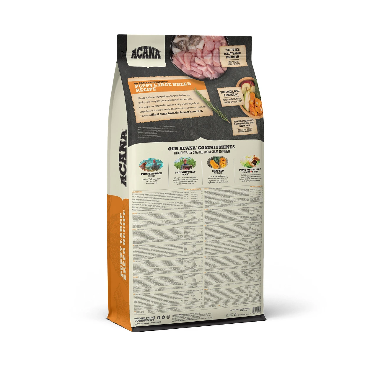 Lorsqu’il s’agit de nourriture pour chiots ACANAMD, chaque ingrĂ©dient compte, c’est pourquoi notre recette Puppy Large Breed a Ă©tĂ© soigneusement Ă©laborĂ©e pour prendre soin de votre animal. Riche de 70 % d’ingrĂ©dients d’origine animale de haute qualitĂ©, comme du poulet frais, Ă©quilibrĂ©e avec 30 % de fruits, de lĂ©gumes et d’ingrĂ©dients vĂ©gĂ©taux, cette recette fournit Ă votre chiot en pleine croissance les protĂ©ines et les Ă©lĂ©ments nutritifs dont il a besoin pour favoriser son dĂ©veloppement rapide. Avec ces ingrĂ©dients Ă©quilibrĂ©s et de haute qualitĂ©, chaque repas de la recette pour chiots de grande race d’ACANA ressemble Ă un repas directement achetĂ© sur le marchĂ©.