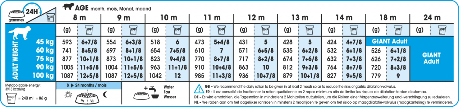 Nous appelons la période de entre 8 et 18/24 mois la 2ème phase de croissance. Le squelette est formé et les muscles se développent. Giant Junior a été spécialement développé pour les chiots de très grandes races. Les grosses croquettes sont facile à mâcher et contribue à la santé des dents et au nettoyage des dents.