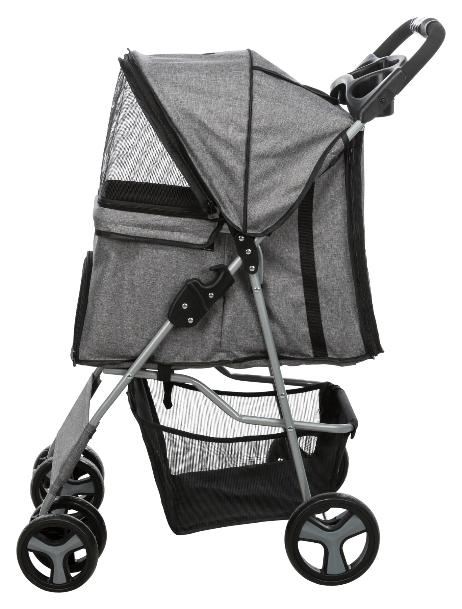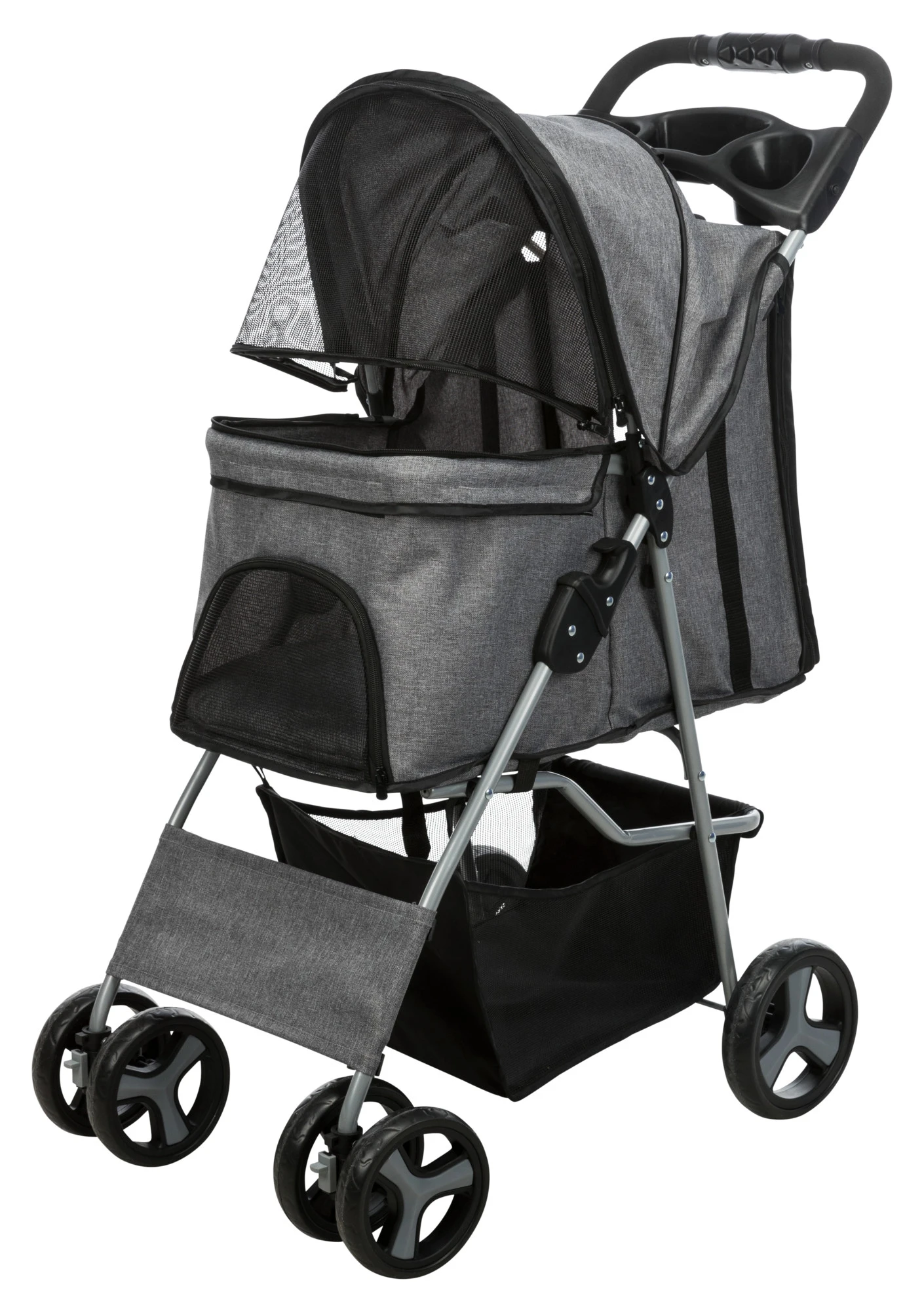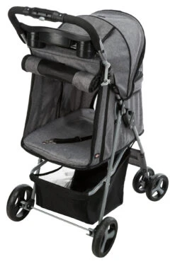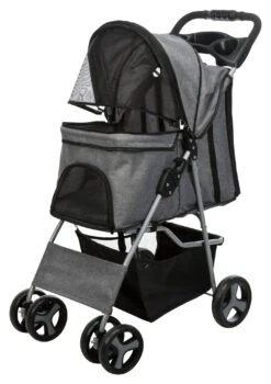Buggy pour chiens. Cette poussette est dotĂ©e d’un système de pliage rapide et la barre de poussĂ©e peut ĂŞtre actionnĂ©e d’une seule main. Il y a deux freins de stationnement.